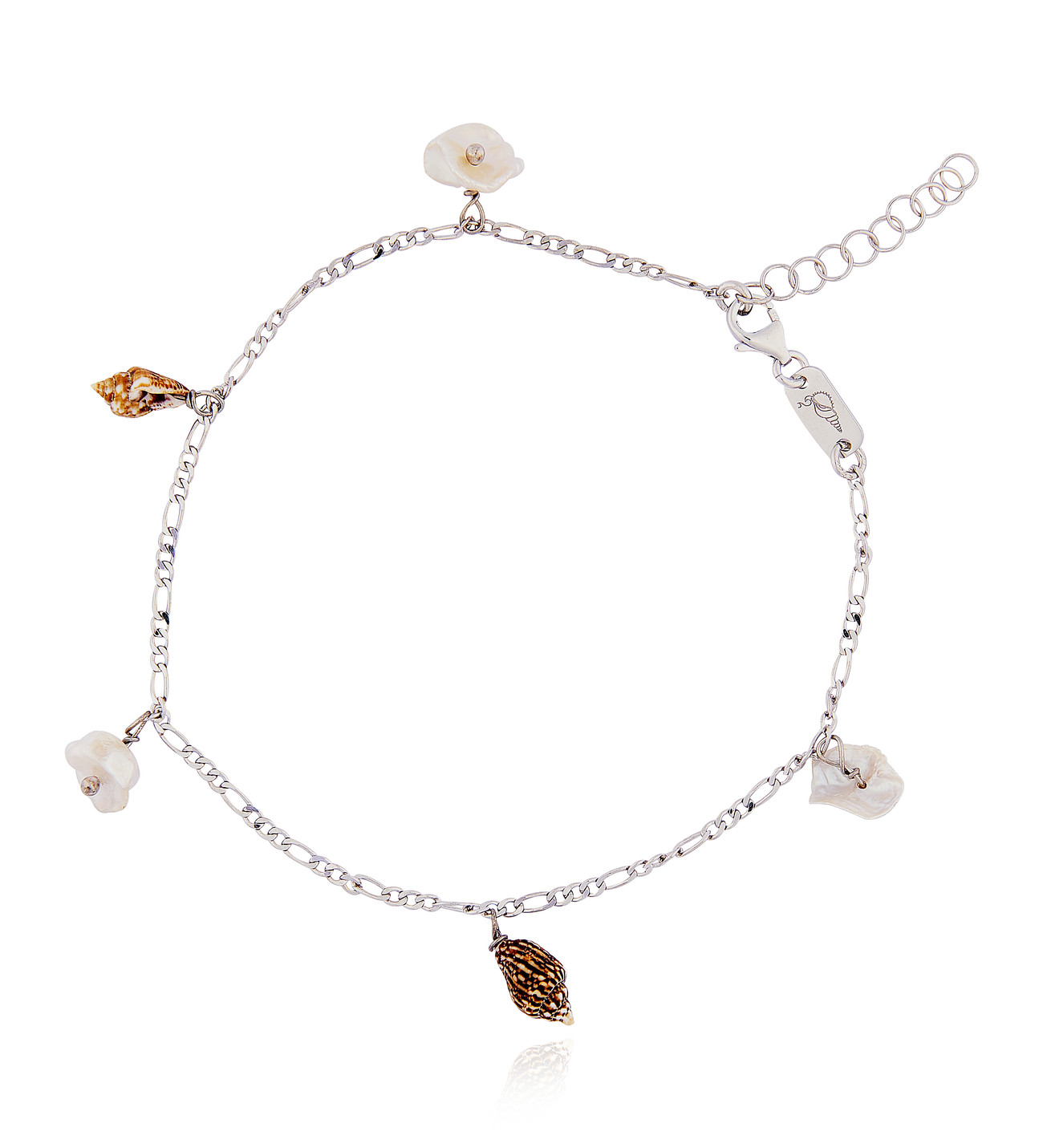 This delicate anklet has 23cm of chain length and an additional 3 cm for adjustabe length to ensure the perfect fit every time. It combines natural sea shells along with luxurious white keshi pearls.